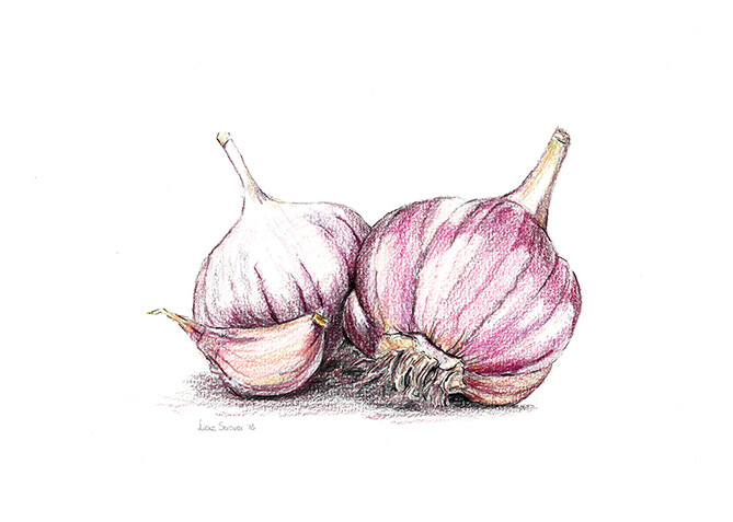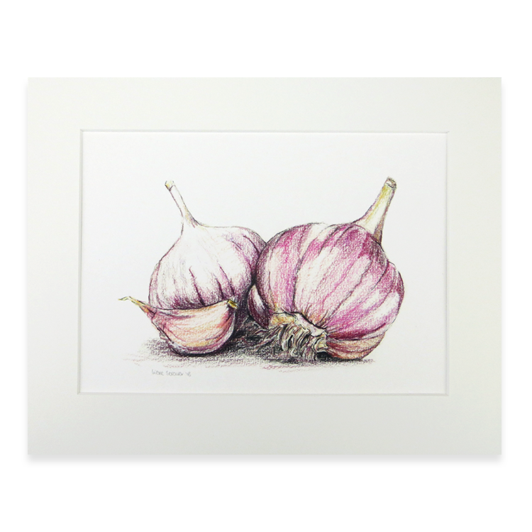 Mooie artprint van knoflook op A4 formaat. De originele illustratie is gemaakt met grijs potlood (H), en uitgewerkt met de Polychromos kleurpotloden van Faber Castell en fineliners in verschillende diktes.