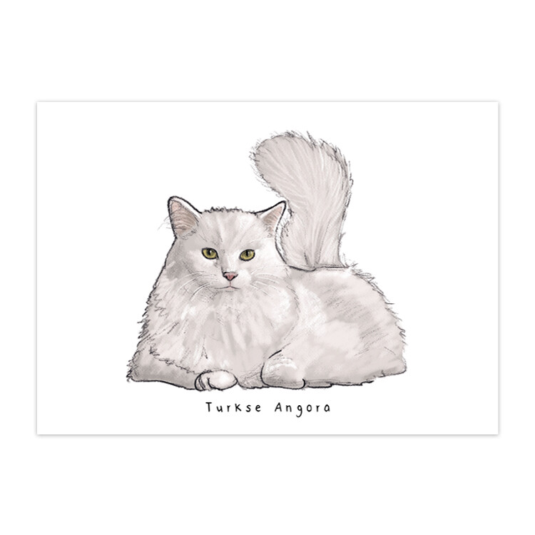 Wenskaart met illustratie van een Turkse Angora, deze kaart is onderdeel van een serie raskatten die ik voor een educatieve uitgeverij tekende. Deze kaart is ook in een set van 7 kattenkaarten te bestellen.
