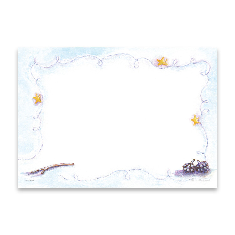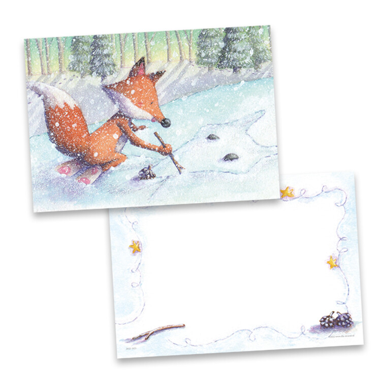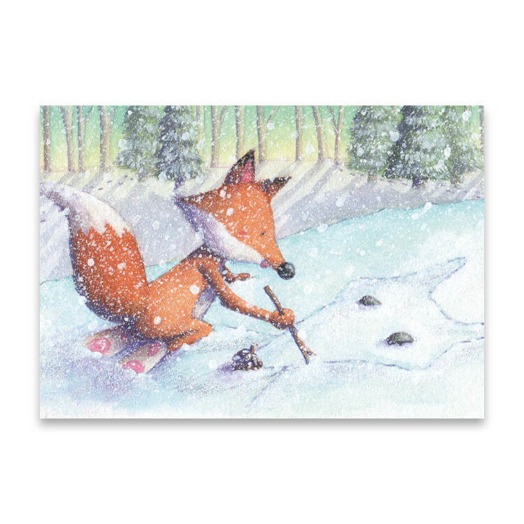 Wenskaart met een winterse illustratie van een vosje die een zelfportret in de sneeuw aan het tekenen is. De achterzijde heeft een mooi geïllustreerd kader.