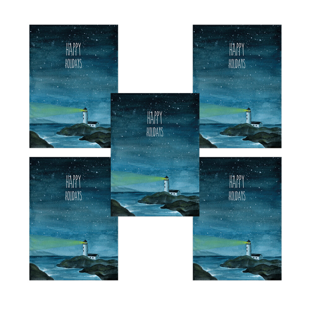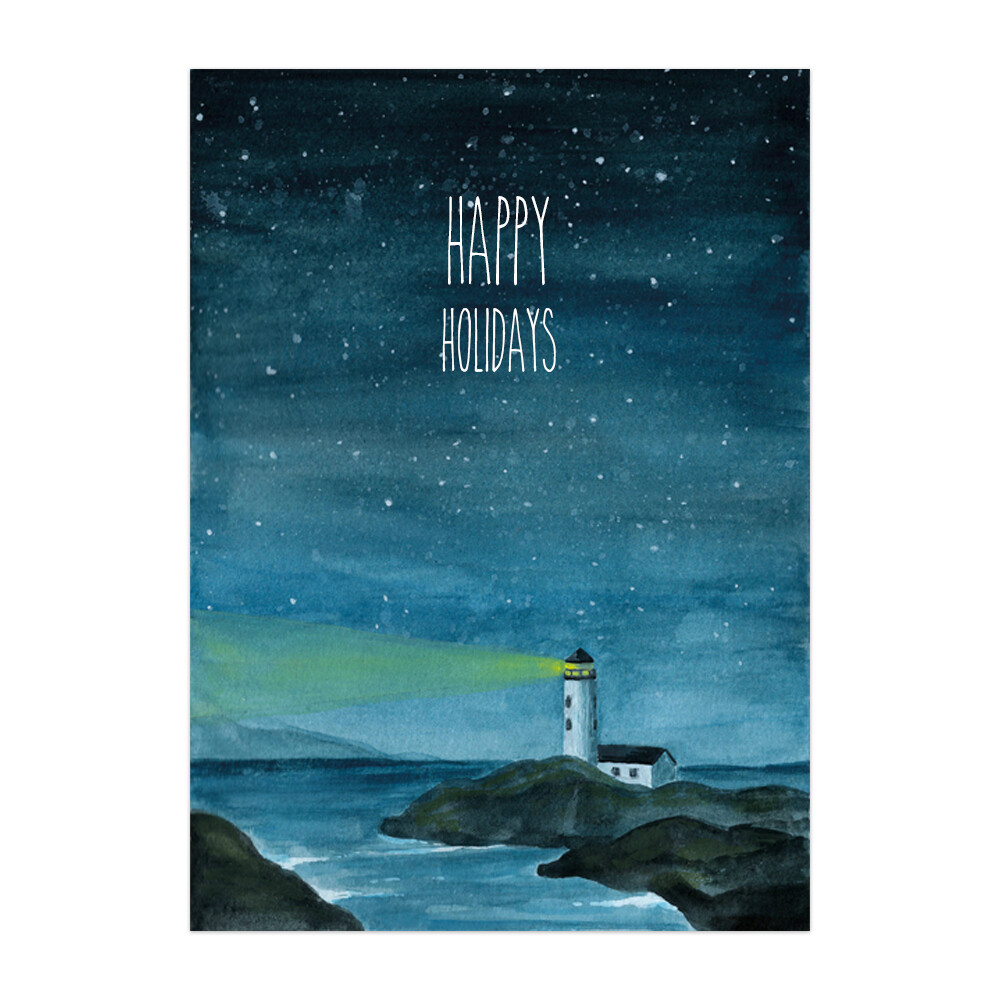 Sfeervolle kerstkaart met een vuurtoren als lichtje in de duisternis en de tekst Happy Holidays.
